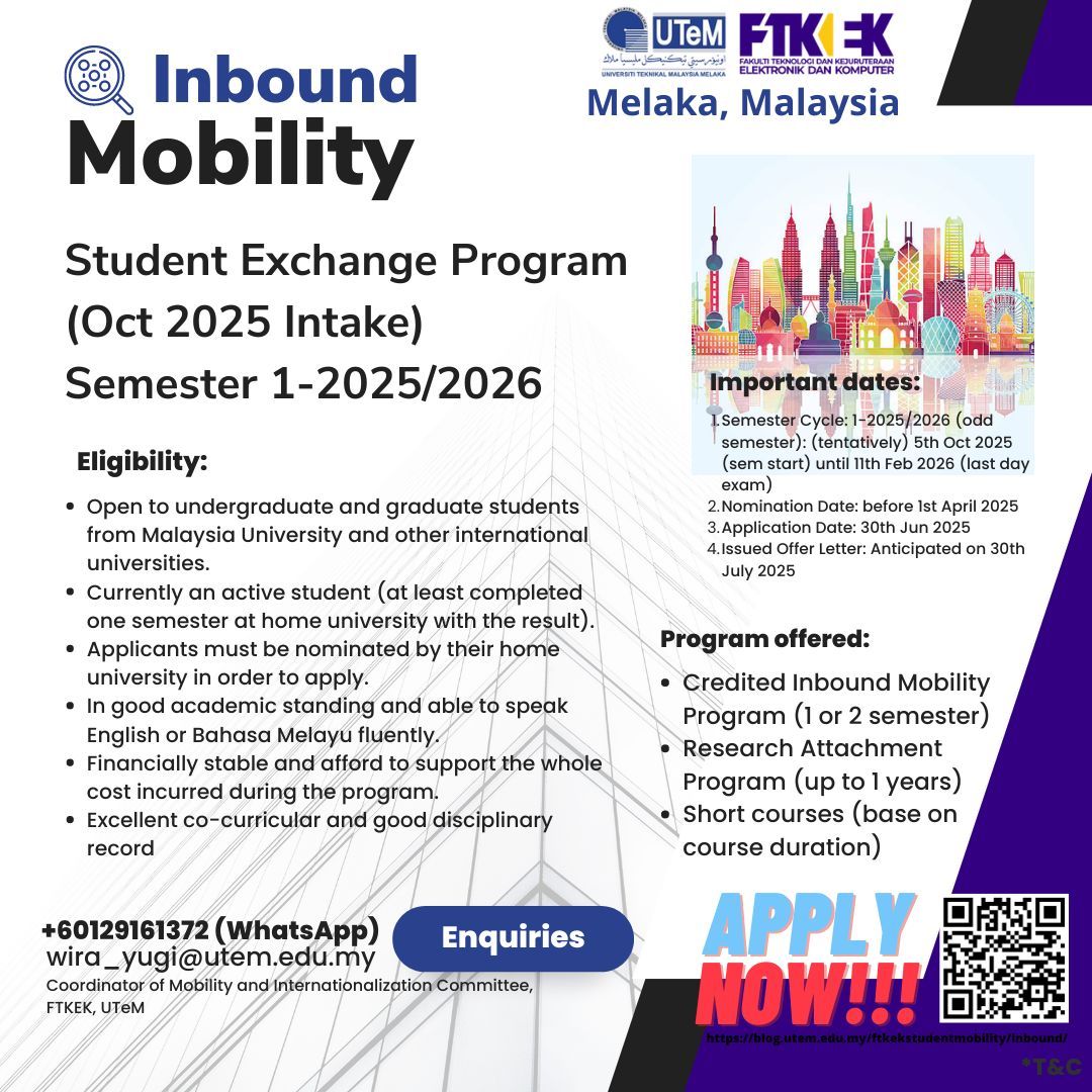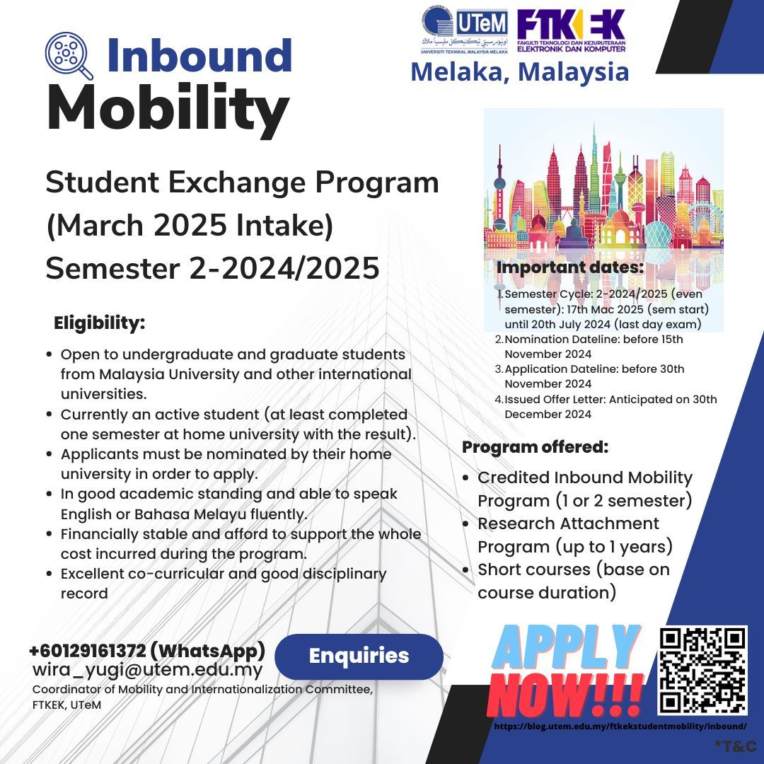 We are excited to welcome students worldwide to join our esteemed mobility program at the Faculty of Electronics and Computer Technology and Engineering (FTKEK), Universiti Teknikal Malaysia Melaka (UTeM). This program offers a unique opportunity to enhance your academic journey by immersing yourself in a multicultural learning environment while experiencing cutting-edge electronics, computer engineering technology, and engineering...