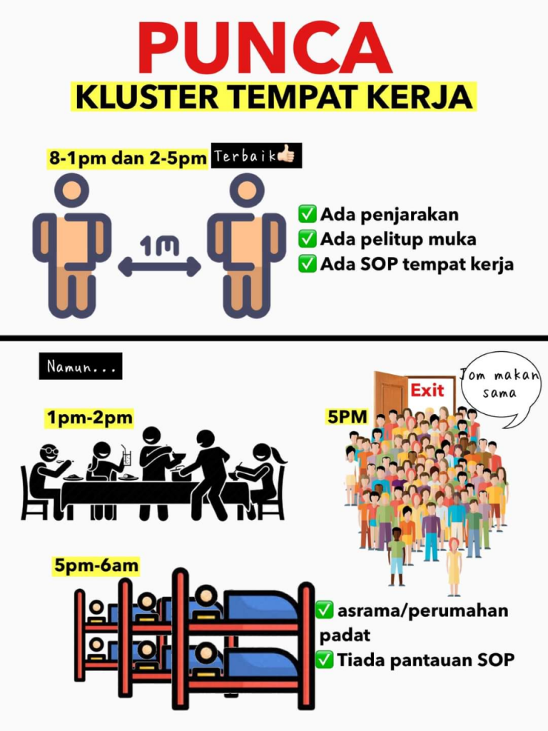 Peningkatan mendadak kes positif Covid-19 kebelakangan ini adalah berkaitan kluster tempat kerja. Perintah Kawalan Pergerakan (PKP) 2.0 yang dilaksanakan adalah untuk menjaga kepentingan kesihatan dan ekonomi. Bagaimanapun, kejayaan strategi itu memerlukan kerjasama majikan bagi memastikan semua amalan pekerjaan dan pekerja sentiasa patuh prosedur operasi standard (SOP) ditetapkan. Majikan juga bertanggungjawab menyediakan tempat kediaman kondusif serta memastikan pekerja mengamalkan langkah pencegahan penularan Covid-19.
