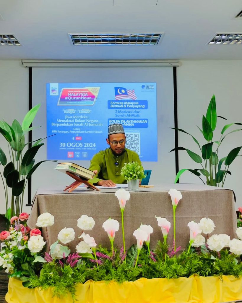Pada 30 Ogos 2024, bersamaan dengan 30 Safar 1446H, Perpustakaan Laman Hikmah (PLH) telah berjaya menganjurkan program QuranHour@PLH bersempena sambutan Hari Kemerdekaan ke-67. Program ini berlangsung di Bilik Tayangan, Perpustakaan Laman Hikmah serta disiarkan secara langsung di FB Live PLH dari pukul 10.00 pagi hingga 11.00 pagi.