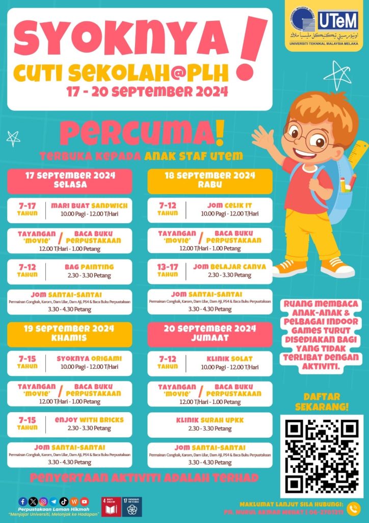 Perpustakaan Laman Hikmah (PLH), Universiti Teknikal Malaysia Melaka (UTeM), baru-baru ini telah mengadakan program menarik bersempena cuti sekolah bertajuk “Cuti Sekolah @ PLH”. Program ini diadakan dari 17 hingga 20 September 2024 dan terbuka secara percuma kepada anak-anak kakitangan UTeM yang berumur dari 7 hingga 17 tahun.