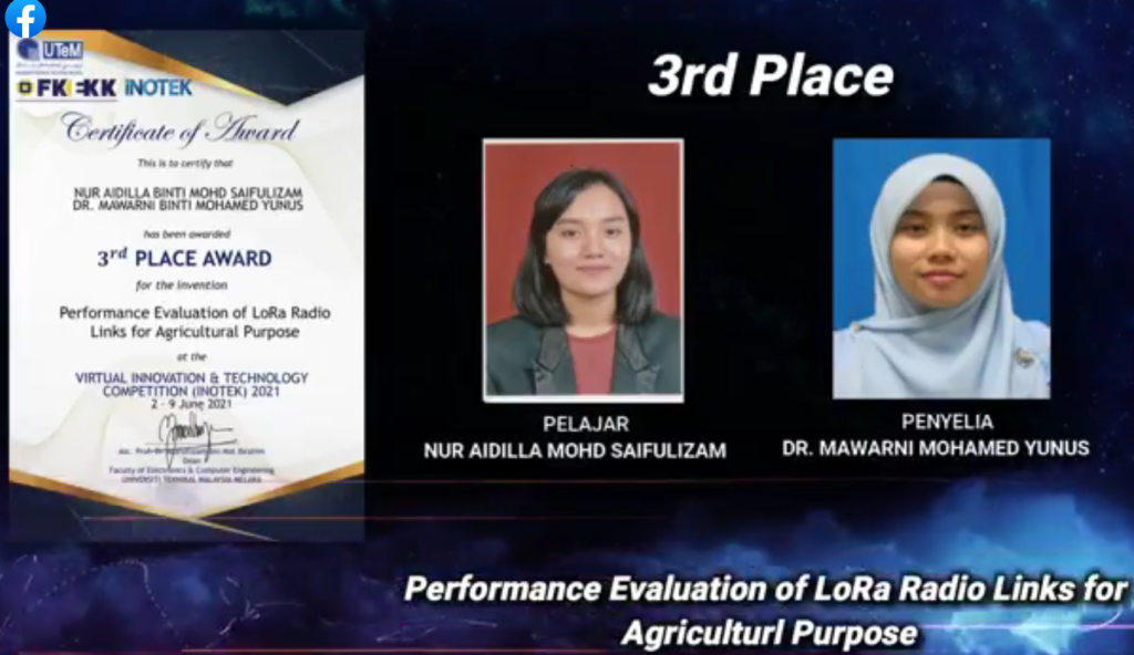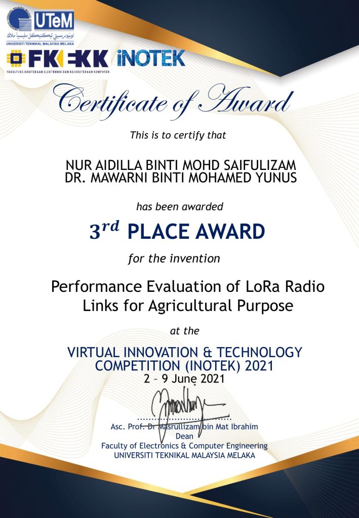 | 2020/2021 | NUR AIDILLA BINTI SAIFULLIZAM | BENG | Performance Evaluation of LoRa Radio Links for Agricultural Purpose. Virtual INOTEK 2021 – GOLD medal, THIRD PLACE AWARD (Emerging Technology) | Completed |