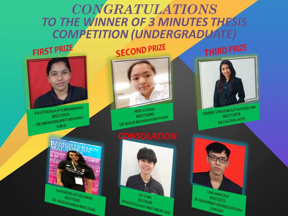 | 2019/2020 | PAVITHERA A/P SUBRAMANIAM | BENG | Performance Evaluation of LoRa Radio Link in the Building for an Indoor Environment. Three Minute Thesis Competition (FKEKK) – FIRST PLACE Award | Completed |