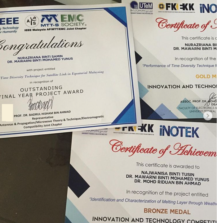 | 2018/2019 | NURAZRIANA BINTI SAMIN | BENG | Performance of Time Diversity Technique for Satellite Communication in Malaysia. INOTEK 2019 – GOLD medal, OUTSTANDING FINAL YEAR AWARD (IEEE) | Completed |
