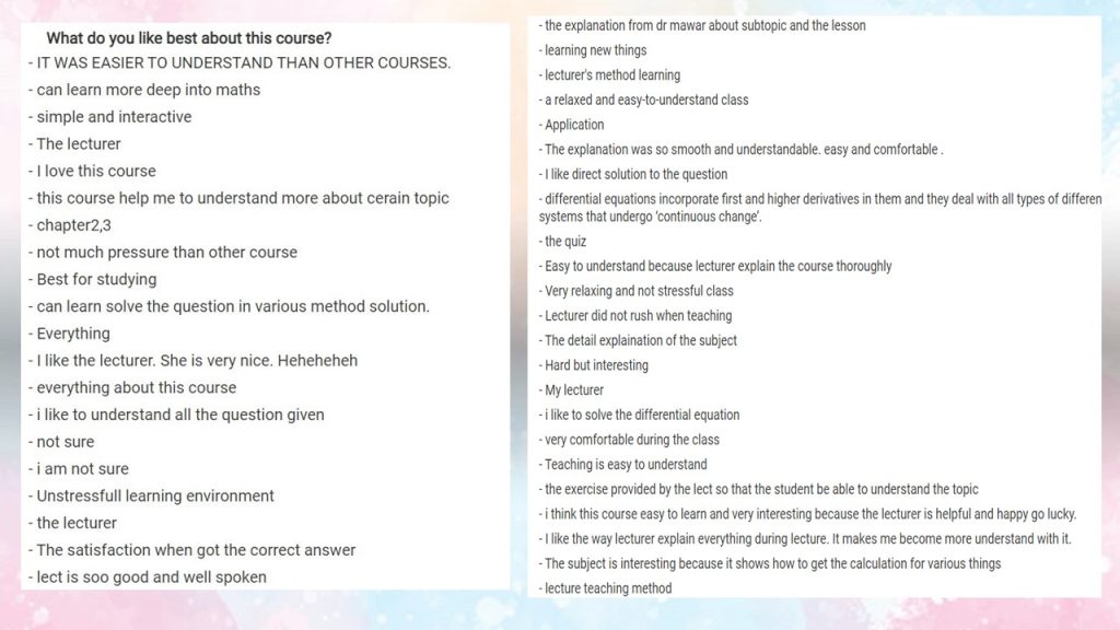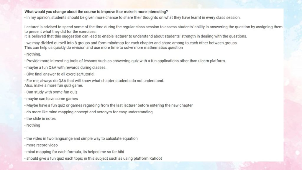 In addition to this assessment, gradually I provided a survey in the ULearn to see the details of student’s perspective on their performance in class and my teaching style. This allows me to refine, modify, and change my teaching method to meet the needs of my students throughout the semester. This is vital to the success of my teaching because the needs of my students change, and I need to change with them. Enclosed here some of the feedback from students: