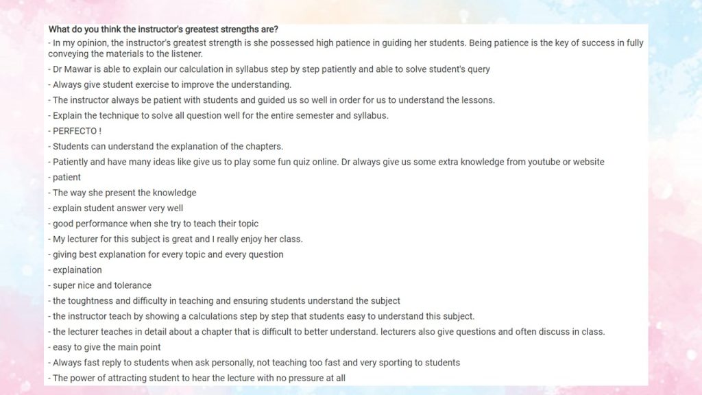 Majority of the students were somewhat satisfied with my teaching style and it is personal pleasure to receive a good feedback from them. To some extend it encourages me to improve every semester. I do hope students enjoy being in my class and benefits much.