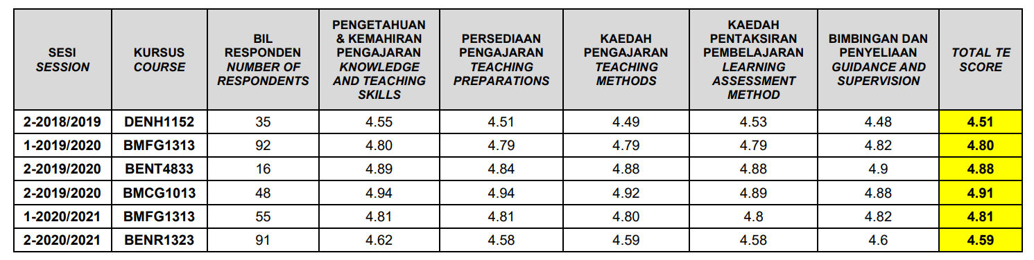 At the end of each semester, students will complete Course Evaluation Report prepared by the Pusat Jaminan Kualiti & Akreditasi (PJKA), UTeM as an assessment and review of the lecturer’s teaching performance. The evaluation comprises of a few sets of questions, covering the course aspects as well as the attribution of a teacher with capping points of 5.0. This assessment is important to help me reflect and continually evaluate my performance as a teacher. Enclosed below are my assessment scores for various courses.