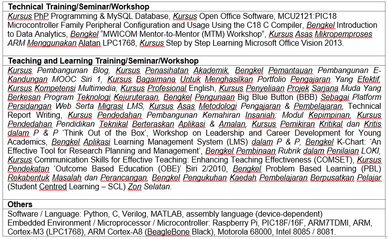 Other than that, skills related to computer engineering field such as programming in C, Python, MATLAB and assembly language (device-dependent) that had been acquired through out the year are as listed in Table 7. These additional skills are important, especially in supervising the students for their projects; which will be continuously upgraded to keep up with the technology.